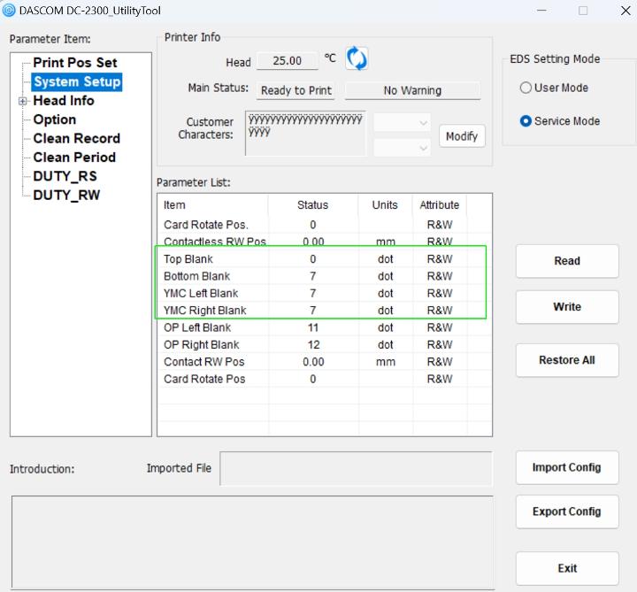En el driver se debe verificar en la sección de configuración, en la opción "System Setup", y ajustar los valores de áreas en blanco ("blank") de modo de minimizar algún espacio en blanco en el contorno de la tarjeta. Esto valores se deben ajustar con precaución, ya que hacerlo incorrectamente podría dañar la cinta de la impresora, por lo que se sugiere consultar con nuestro departamento de soporte.